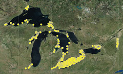 Each yellow dot depicts the location of a receiver—a small, data-logging computer—which is anchored near the bottom of the lake bed along migration routes, near spawning areas, and other places of interest to scientists. A searchable version of this map is available on the GLATOS website.