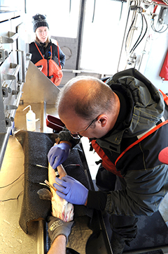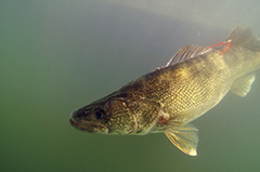 A biologist surgically inserts an acoustic telemetry tag into a walleye on Lake Erie. Each time a tagged fish swims by a receiver, the tag’s unique ID code is recorded along with the date and time. Some tags also record the depth and temperature. Photo: A. Muir, GLFC