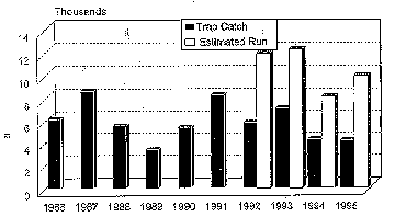 The Service annually has operated an assessment network for spawning-phase sea lampreys on 11-13 streams in Lake Michigan, and we present this information as total catch in all other rivers and estimated spawning population in the Manistique River, 1986-95 (Fig. 3). This index shows the population in the lake has been relatively stable during the time period, but our assessments also show lampreys are more abundant in the northern part of the lake than in the south.