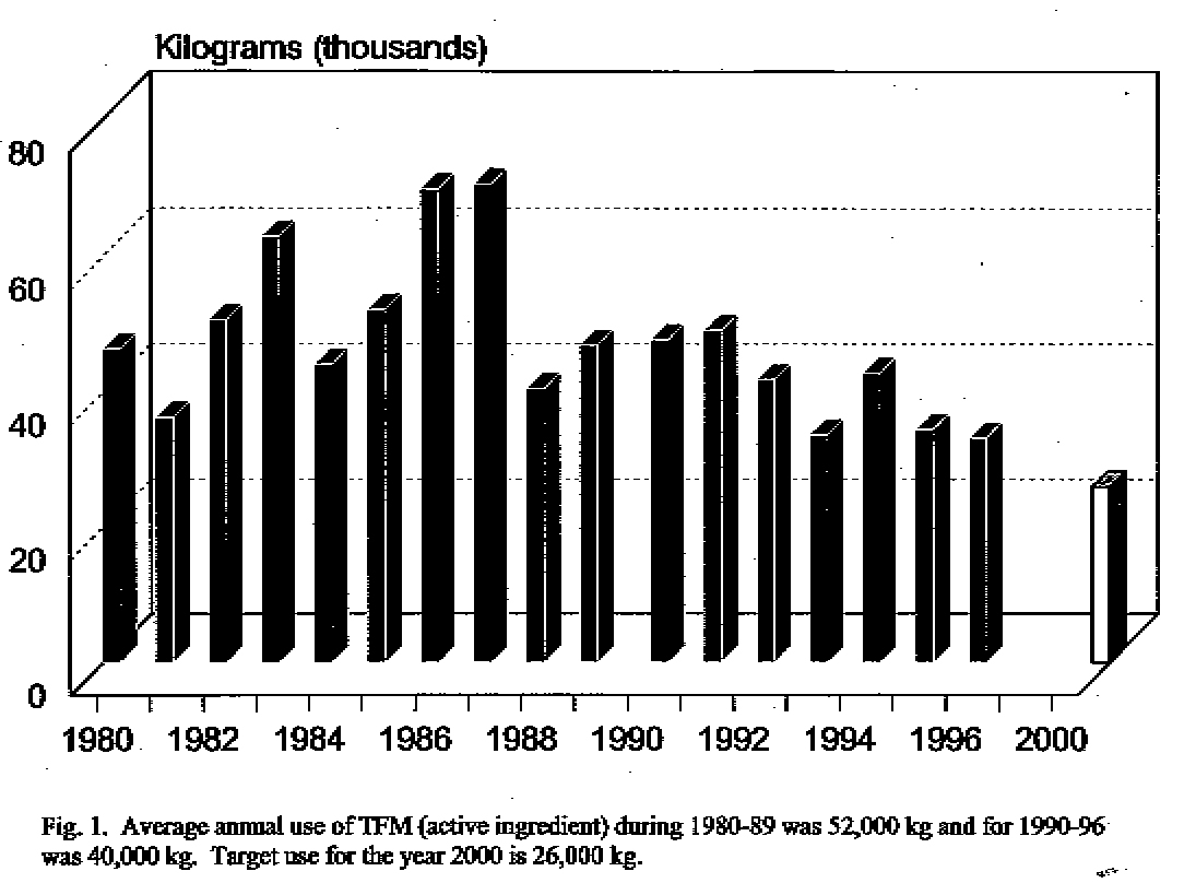 Fig. 1. Average annual use of TFM (active ingredient) during 1980-89 was 52,000 kg and for 1990-96 was 40,000 kg. Target use for the year 2000 is 26,000 kg.