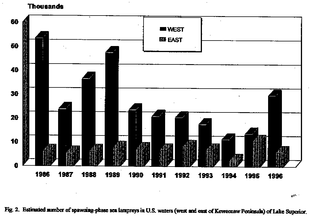 The Service maintains an extensive trapping network for spawning-phase sea lampreys in index streams of the south shore of Lake Superior and annually estimates populations east and west of the Keweenaw Peninsula (Fig. 2). Populations east of the Peninsula generally remained stable during 1987-93, declined substantially in 1994, but increased again in 1995 and 1996. Populations to the west generally declined during 1989-95 and increased in 1996. The program achieved the sea lamprey target for Lake Superior (50 percent decline by 2000) in 1994 when compared to the 1986-90 average of 42,500 (13,700 in 1994). In 1996, the estimated population increased to 35,700 which is a decline of 16 percent of the 1986-90 average.