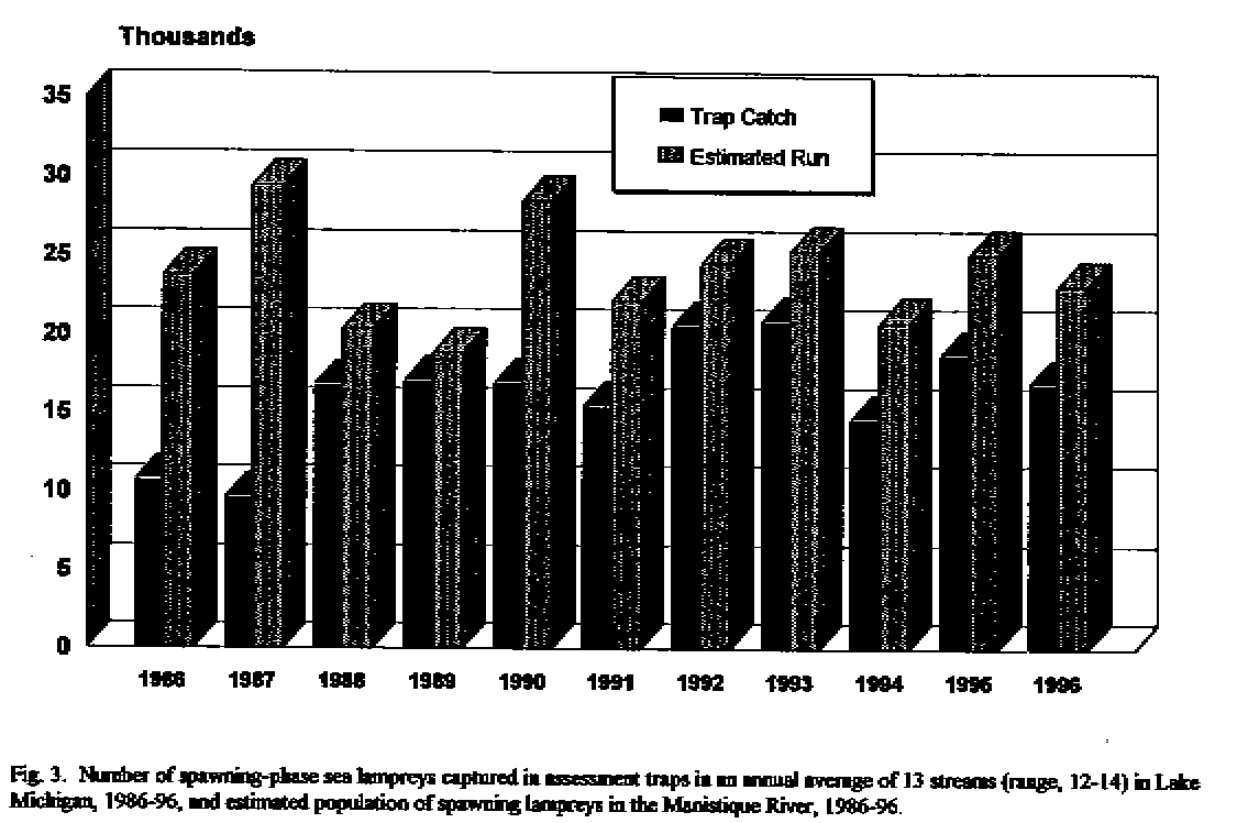 The Service annually has trapped spawning-phase sea lampreys in 12-14 tributaries of Lake Michigan, and estimated the number of spawning lampreys in the Manistique River during 1986-96 (Fig. 3). This index shows the population in the lake has been stable during the time period, but assessments also show lampreys are more abundant in the northern part of the lake than in the southern part.